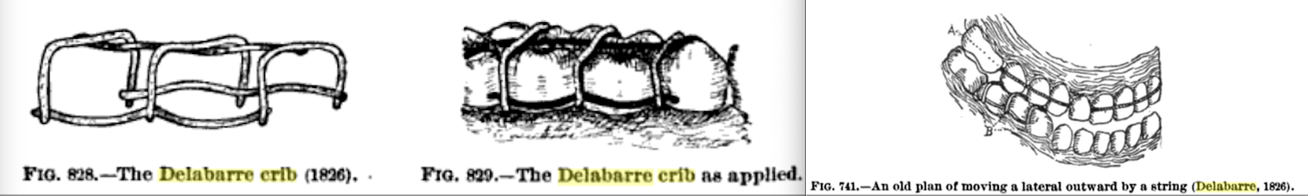 Image Courtesy References: 11. The History of Orthodontics: A. Lingual hook; B. Schange’s crib with labial arch; C. device to correct extreme protrusion; D. using the India rubber elastic band (1841).